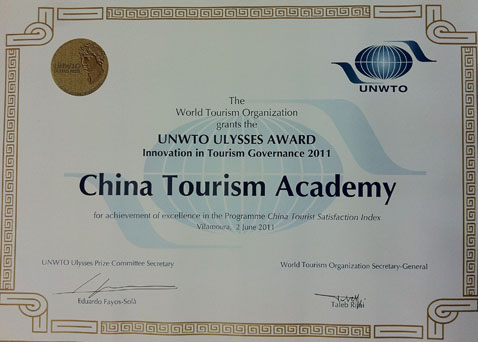 5月9日联合国世界旅游组织公布了2011年联合国世界旅游组织尤利西斯奖获奖名单。我院的"全国游客满意度调查"项目获得该奖项的政府创新奖。这是国内首个获得世界旅游组织的研究奖项。国家旅游局邵琪伟局长、杜江副局长对此给予了充分肯定,认为此奖项既是一种荣誉,更是我国旅游管理创新与旅游学术成果面向世界的一次重要展示。