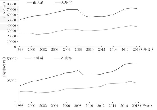 Figure 3 Comparison of the number of inbound and outbound tourists and their spending in the UK