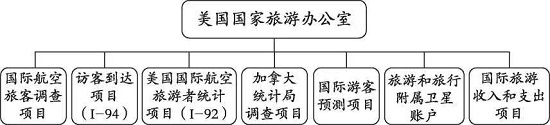 (II) United States 1. Implementation and concept setting of tourism statistics (1) Implementation department of tourism statistics The National Travel and Tourism Office (NTTO) under the U.S. Department of Commerce [8] is responsible for collecting, analyzing and publishing international tourism statistics. It is the management department of the U.S. tourism statistics system, which consists of seven research projects (see Figure 3): ① International Air Passenger Survey Project, which collects passenger characteristics from more than 30 major countries traveling to and from the United States. ② Visitor Arrivals Project (1-94) data provides official data on monthly and annual overseas visitor arrivals in the United States. ③ The U.S. International Air Travel Statistics Project (1-92) provides international air traffic statistics. ④ Statistics Canada survey project provides data on the flow of tourists between the United States and Canada. ⑤ The International Visitor Forecast Project provides forecasts of international tourists in 20 major tourism markets based on econometric models. ⑥ Tourism and Travel Satellite Account measures the economic impact of tourism. ⑦ International Tourism Revenue and Expenditures Project provides import and export data and trade balance information for the U.S. tourism industry.