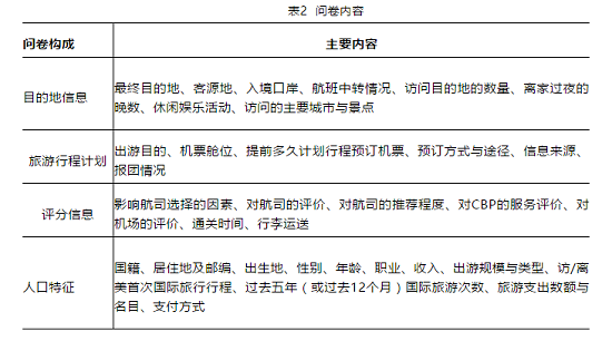 SIAT randomly surveyed non-U.S. residents visiting the United States and U.S. residents departing the United States on selected flights. The content of the questionnaire is shown in Table 2.