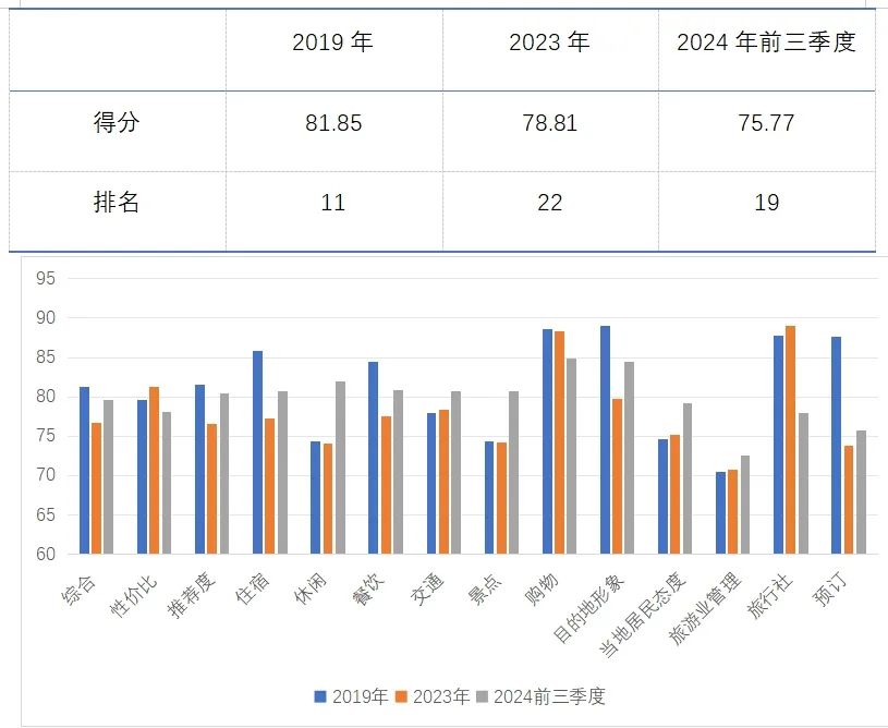 In the first three quarters of 2024, the satisfaction of Chinese tourists traveling to Italy was 75.77 points, ranking 19th in the world. Compared with 2019 and 2023, the satisfaction score of Italian outbound tourists dropped from the "satisfied" range (80-85 points) to the "basically satisfied" range (75-80 points).