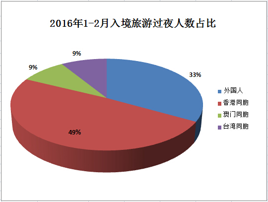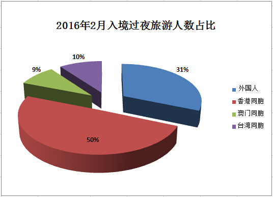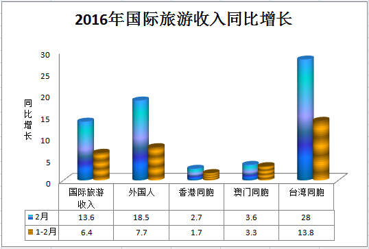 Inbound tourism in February 2016 Measurement Unit Monthly year-on-year growth %1-Monthly cumulative year-on-year growth %Number of inbound tourists 10,000 person-times 984.446.22095.283.8 Foreigners 10,000 person-times 169.7318.8378.499.5 Hong Kong compatriots 10,000 person-times 587.972.51250.561.7 Macao compatriots 10,000 person-times 179.913.6378.173.3 Taiwan compatriots 10,000 person-times 46.8226.788.0613.2