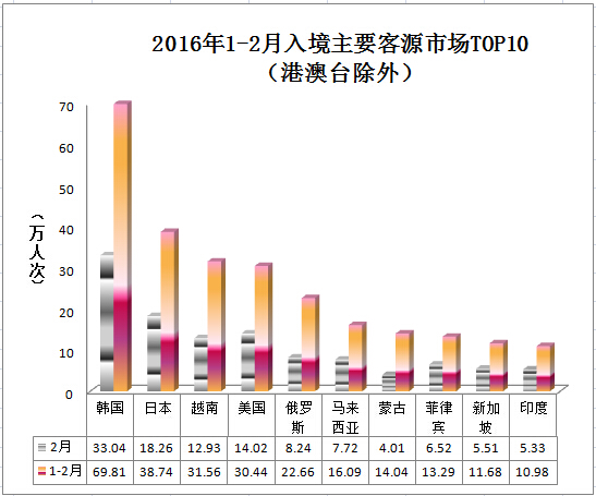 Situation of major source markets in February 2016 by cumulative number of inbound tourists from January to December this month Country/Region Name Number of inbound tourists Year-on-year growth Number of inbound tourists Year-on-year growth Ranking (10,000 person-times) (%) (10,000 person-times) (%) 1 Hong Kong, China 587.97 2.51 250.56 1.7 2 Macao, China 179.9 13.63 78.17 3.3 3 Taiwan, China 46.82 26.78 8.06 13.2 4 South Korea 33.04 17.96 9.81 7.7 5 Japan 18.26 10.33 8.74 2.8 6 Vietnam 12.93 31.93 1.56 10.27 United States 14.02 8.73 0.44 58 Russia 8.24 51.72 2.66 48.69 Malaysia 7.72 21 .916.0918.210 Mongolia 4.01-14.614.041.811 Philippines 6.5236.513.2913.412 Singapore 5.5115.111.685.413 India 5.33610.986.614 Canada 4.31379.7419.315 Germany 4.7745.89.728.716 Thailand 3.812.29.330.717 Australia 4.0711.69.01-1.218 United Kingdom 3.926.38.35-2.819 Indonesia 4.0349.18.043120 France 3.416.77.4-0.8