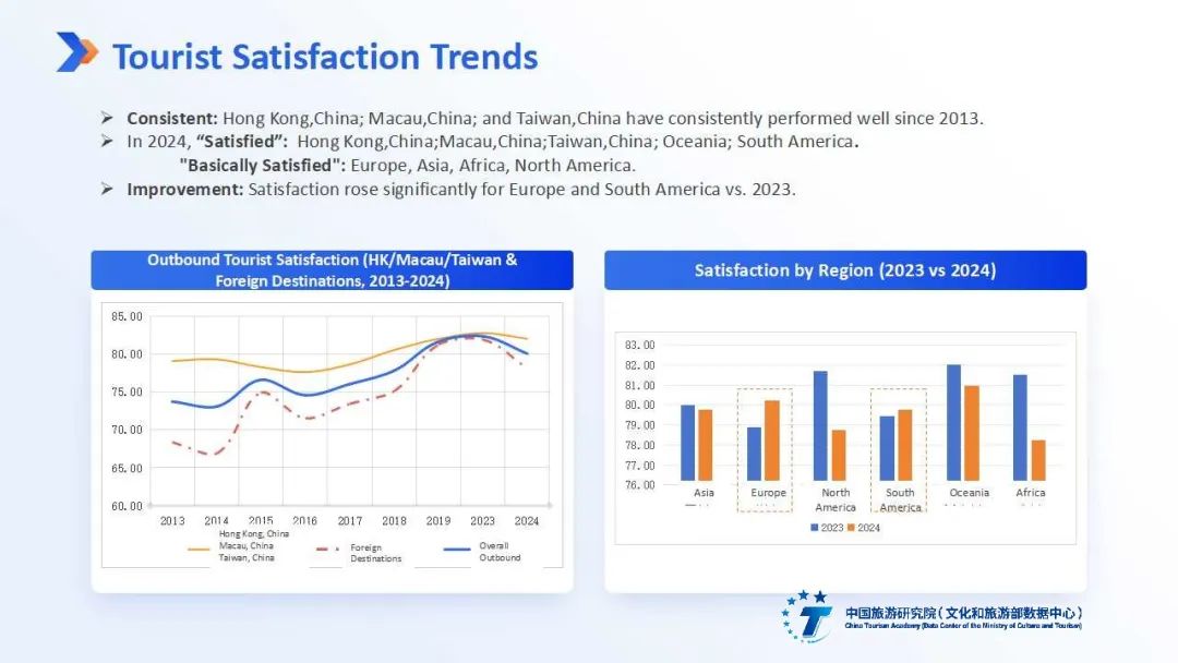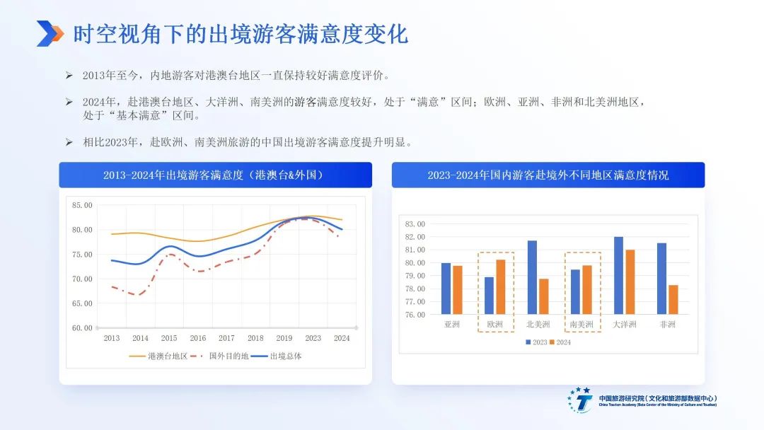 中国旅游研究院游客满意度课题组连续16年开展面向国内、入境、出境三大市场的游客满意度数据监测与研究。2024年,课题组综合线下机场拦访、线上平台调研、短信调查等多渠道数据,收集了面向27个主要出境目的地国家和地区的市场调查数据4万条,面向102个国家和地区的游客评价数据数十万条,形成《2024中国旅游者出境满意度研究报告》,核心观点如下: