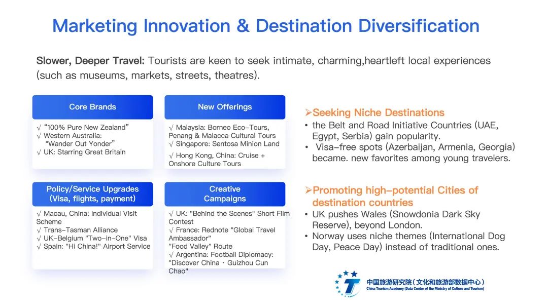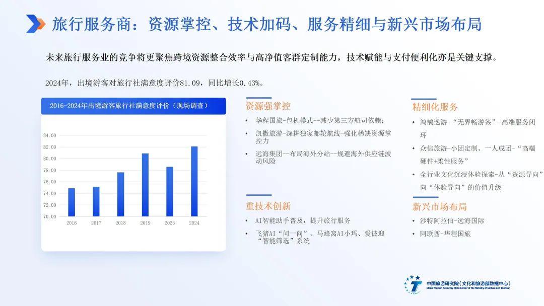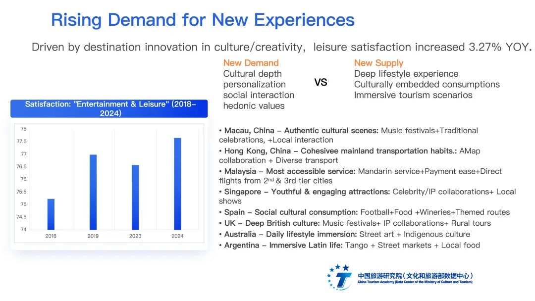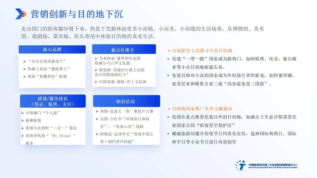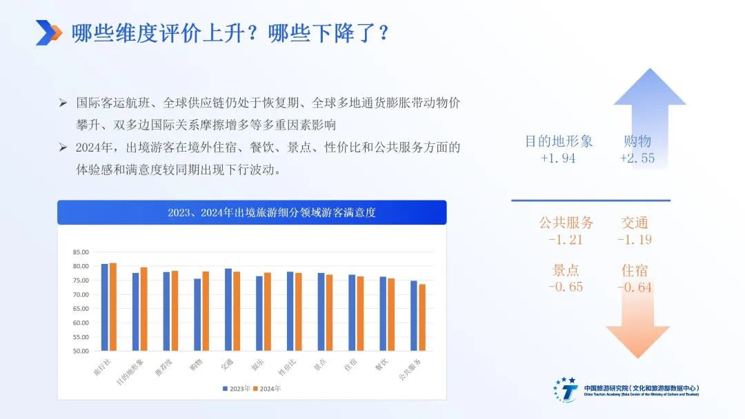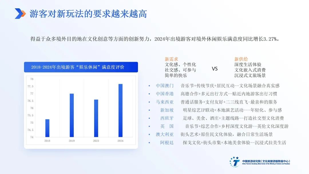 出境旅游市场规模稳步增长,游客需求加速迭代背景下,中国出境游客评价维持满意,与活跃涌动的目的地创新密不可分。居民友好度、目的地玩法翻新、购物旅游、旅行服务革新、海外目的地营销创新与小众目的地涌现支撑了中国出境游客的良好旅游体验。