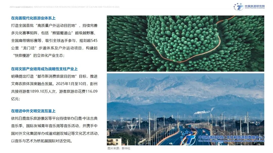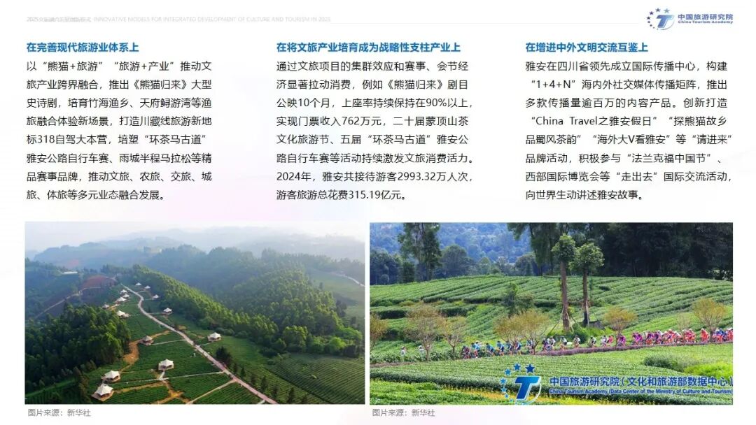 研究报告以习近平文化思想、习近平对旅游工作重要指示为指导,涵盖“服务人民美好生活需要”“构建中华文明标识体系”“创新文化遗产活化利用”“完善现代旅游业体系”“培育战略性支柱产业”“增进中外文明交流互鉴”等6方面内容,构建了包括33个细项的评价体系。课题组综合运用旅游统计数据分析、文旅大数据分析、旅游抽样调查、社会监督评价等方法,遴选出以雅安、盐城、自贡、厦门、彭州为代表的十大“2025年度文旅融合发展创新模式”,以下是研究报告的主要内容: