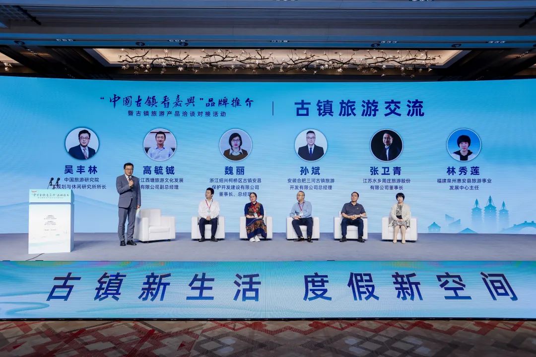 中国旅游研究院规划与休闲研究所所长吴丰林主持古镇旅游交流环节,并与江苏水乡周庄旅游股份有限公司董事长张卫青、安徽合肥三河古镇旅游开发有限公司总经理孙斌、福建泉州惠安县旅游事业发展中心主任林秀莲、浙江绍兴柯桥区古镇安昌?;た⒔ㄉ栌邢薰径鲁の豪?、浙江西塘旅游文化发展有限公司副总经理高毓铖一同围绕古镇业态更新、活化利用、创新举措等内容展开交流对话。