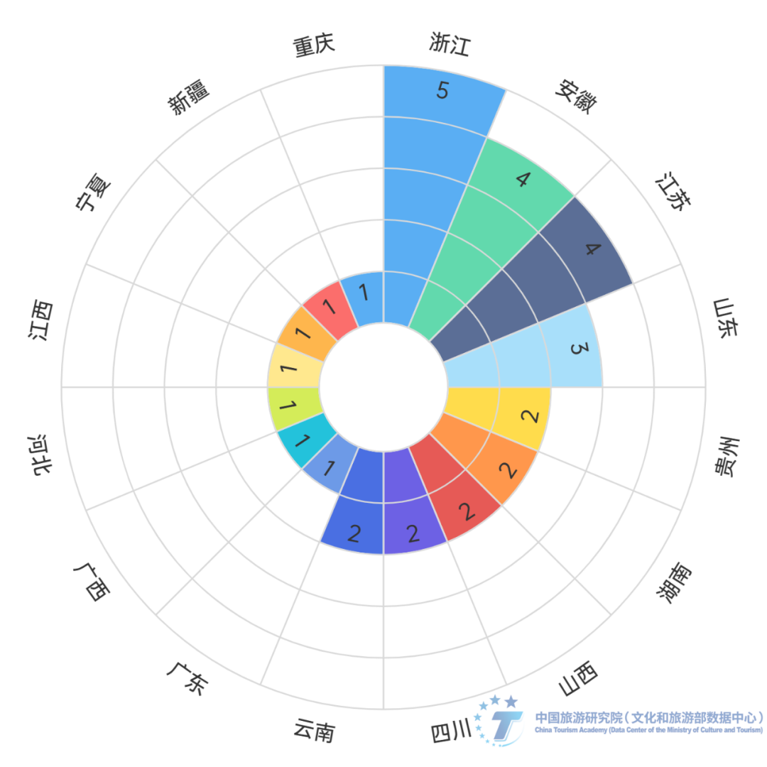 5A级古镇景区在江浙皖地区高度集聚。据统计,全国目前有33个5A级古镇景区。从其空间分布来看,浙江省以西塘古镇、乌镇景区、南浔古镇、廿八都古镇和台州府城5个古镇景区居各省份之首,其次是安徽省、江苏省,均有4个5A级古镇景区。浙江省、安徽省、江苏省3省份5A级古镇景区数量占全国总量的39.4%。5A级古镇景区在江浙皖地区高度集聚。