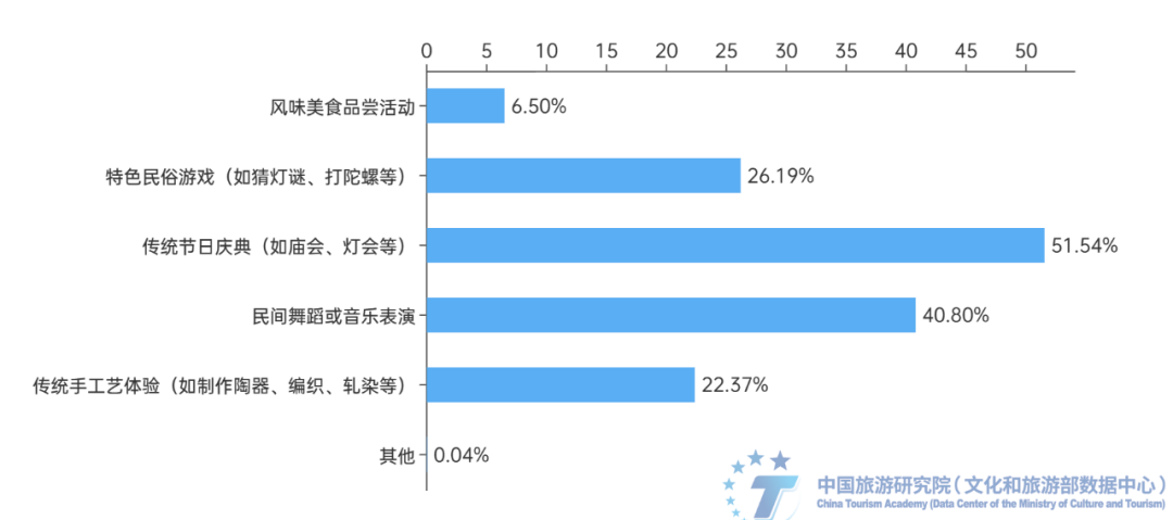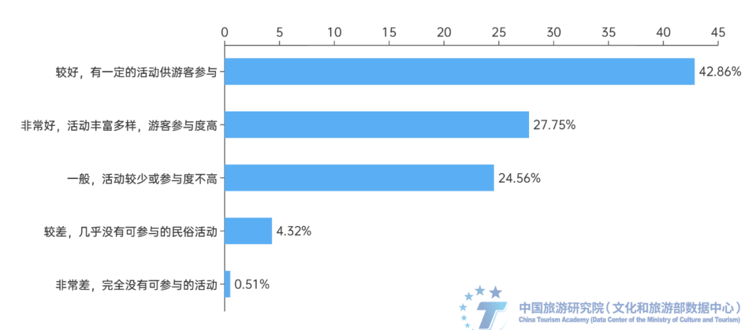 古镇民俗文化活动是文旅融合的重要载体。古镇为游客提供了活动空间,而古镇内民俗活动、民间舞蹈和音乐等则为游客的个人情绪调动和情感共鸣提供可能。调查显示,92.77%的受访者愿意参与当地民俗活动,其中传统节日庆典是最受欢迎的古镇民俗活动,占比达51.54%。其次是民间舞蹈或音乐表演,占比为40.8%。传统手工艺体验和特色民俗游戏分别占比为22.37%和26.19%。此外,对于古镇民俗活动的可参与性,超过半数的受访者认为较好或非常好,有一定的活动供游客参与,活动丰富多样,游客参与度高。
