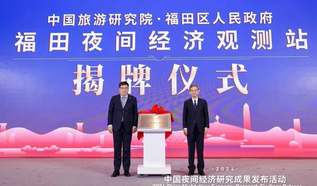 中国旅游研究院院长戴斌与深圳市福田区政协党组书记、主席李世清为“福田夜间经济观测站”揭牌。