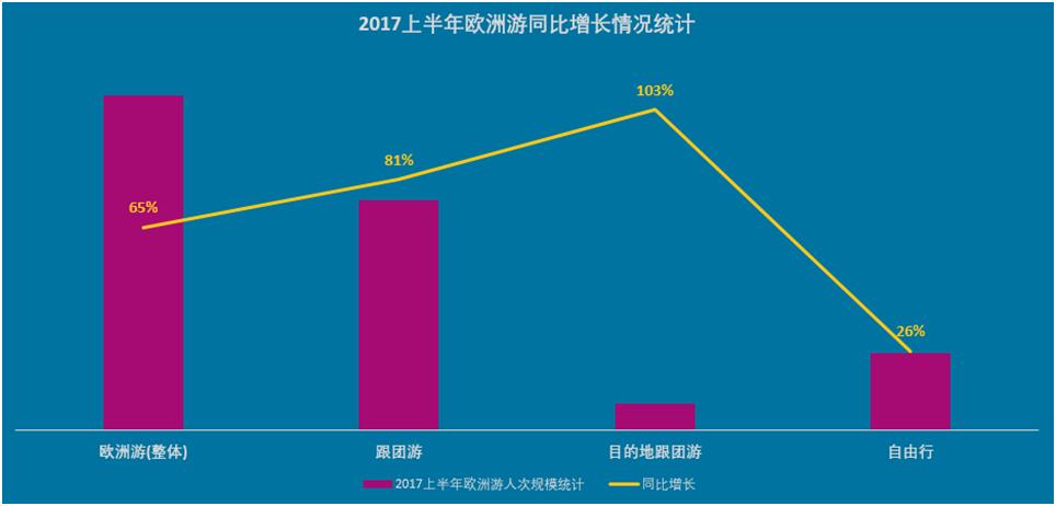 1、2017上半年欧洲游同比增长65%,其中跟团游依然是市场主导,同比增长81%
