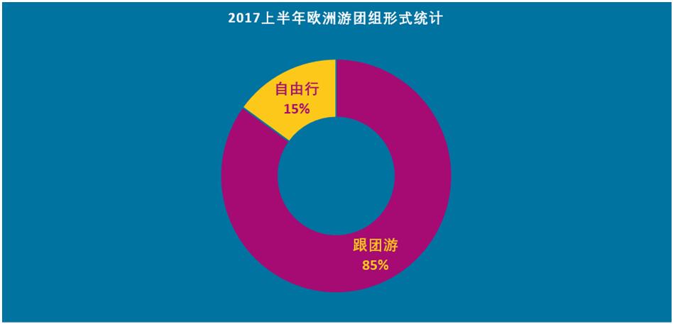 携程旅行网、华远国旅交易数据显示,2017年上半年中国赴欧洲旅游人次同比增长65%,其中跟团游实现了81%的高增长,目的地跟团游增长翻番,增长率达103%。跟团游依然是欧洲游的主要方式,有85%的国人选择跟了团方式。选择自由行的中国游客占比提升到15%,规模同比增长26%。
