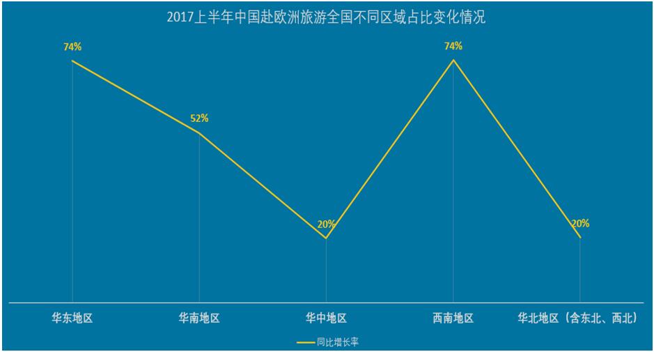 从全国不同区域人群出游习惯与偏好的差异性分析发现:华东市场的客源比重高达到50%,同比增速达到74%,市场占有和同比增速双指标均实现全国领先?;焙突锨蚴谐∪萘拷咏?,中西部地区由于受经济发展水平等因素制约,其欧洲游占比相对较低,但市场潜力正逐步显现,其中西南市场的增速高达74%,接近华东市场。