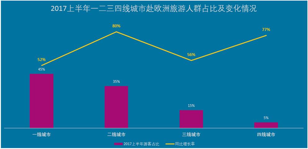 分析出游人群数据发现,赴欧洲游人群在二线城市和四线城市实现了同比80%和77%的高增长,其中二三线城市的市场占比在2017上半年实现了50%的占有率,一二线城市占整体欧洲出境游市场的80%。就增速来看,二三四线城市的增速都要远高于一线城市的增速。显现以“北上广深”为代表的一线城市向二线新锐发展城市转移的势头。