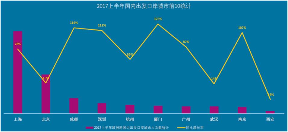 在赴欧洲游出发口岸城市中,2017年上半年出境欧洲的中国游客依然集中于北京、上海两大口岸城市,出境人群比重超过了60%,但成都、厦门、南京等其它口岸城市显示出巨大的增长潜力。
