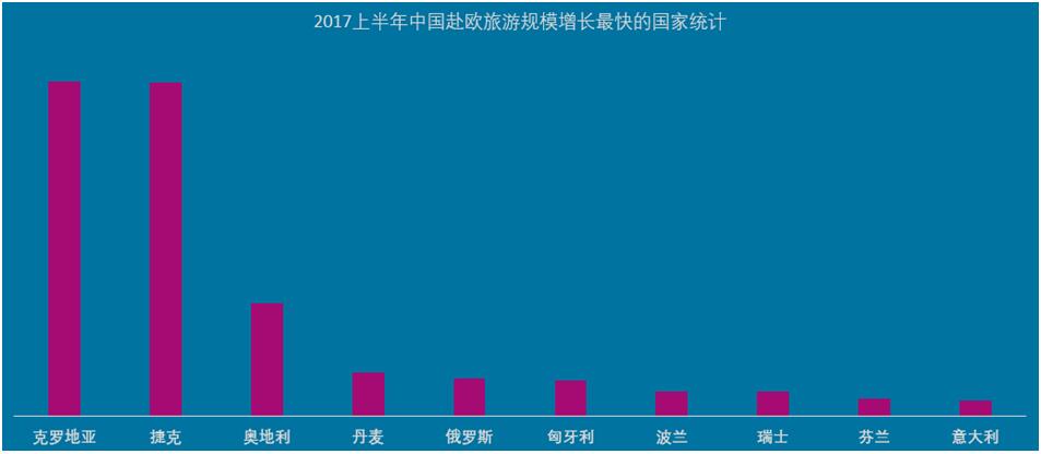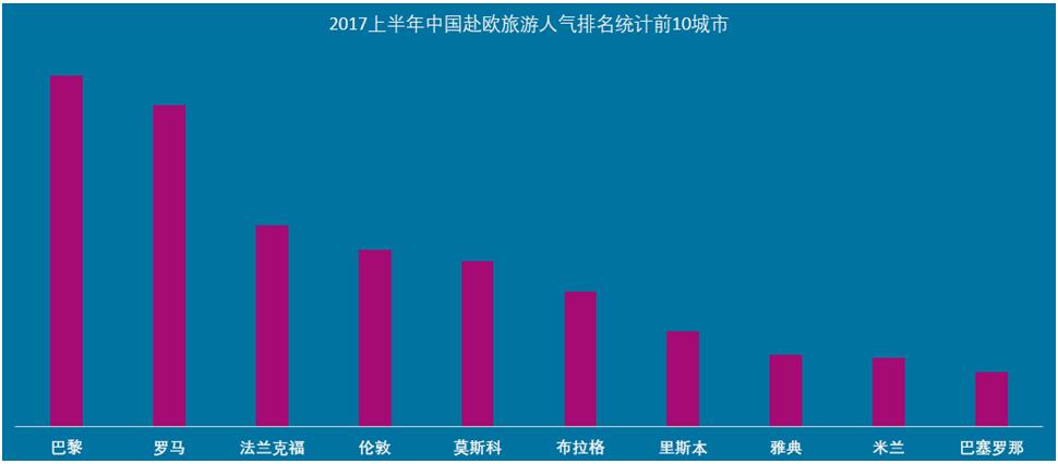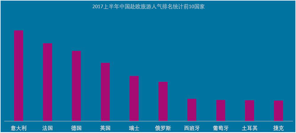 意大利、法国、德国、英国、瑞士、俄罗斯、西班牙、葡萄牙、土耳其、捷克是中国游客选择最多的前十大出境目的地国家。巴黎、罗马、法兰克福、伦敦、莫斯科、布拉格、里斯本、雅典、米兰、巴塞罗那成为前十大人气出境目的地城市。布拉格、维也纳、莫斯科、阿姆斯特丹、赫尔辛基及马德里,2017年都倍受中国游客青睐,游客增速较高。
