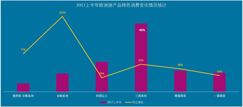 从2017年上半年增速最快的前十大目的地来看,中东欧、俄罗斯-北欧等国家为代表的新兴目的地市场飞速发展。奥地利、瑞士、俄罗斯、意大利等一些传统欧洲游目的地国家,也因消费升级迭代、一带一路等因素的影响,焕发出新的增长活力。未来经典的传统欧洲游与新兴欧洲游市场将进行互补,满足更多中国游客的出游诉求。