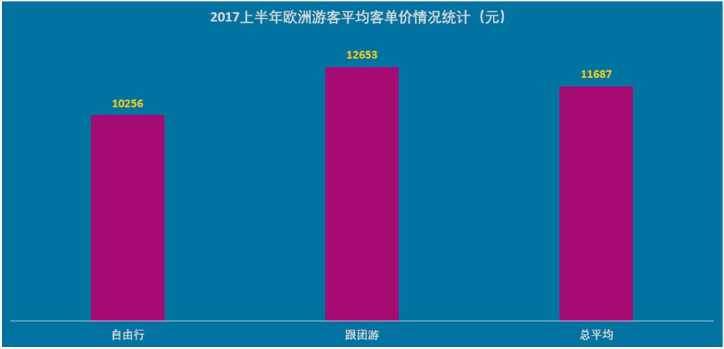 上半年欧洲游跟团游的平均客单价接近13000元。相对于第一季度跟团游的11100元平均客单价有超过1500元的增幅,而自由行的平均客单价相对于第一季度也有超过1100元增长,市场产品价格受旅游季节变动而正常波动,整体价格趋于平稳。