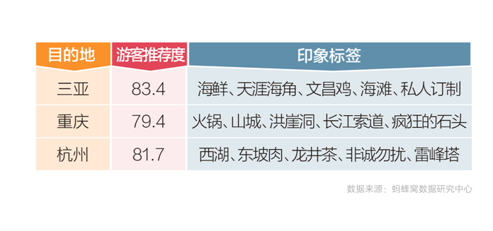 其他城市也各具差异化实力,如三亚的沙滩和海鲜,重庆的火锅与夜景,杭州的西湖与庭院,厦门的文艺和小吃,其中,大海与美食成为吸引游客的两大要素。