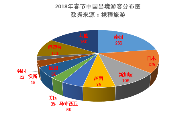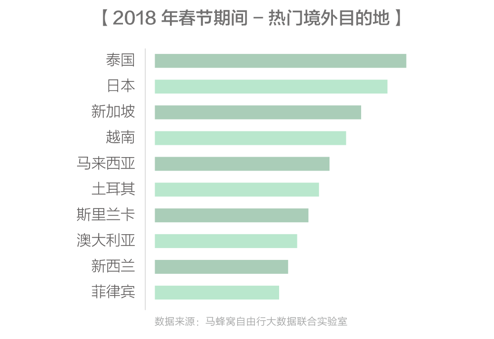 2018年春节期间,反季游是出境游的热门主题,中国游客青睐的目的地仍主要集中在温暖的东南亚地区。结合在线旅游者通过携程APP、网站和携程线下门店预订大数据和马蜂窝数据,春节出境游地域分布图和五大热门国家排行榜:泰国、日本、新加坡、越南、马来西亚。携程预定的其余热门的境外目的地还有印尼、菲律宾、柬埔寨、美国、意大利;马蜂窝其余热门的境外目的地还有土耳其、斯里兰卡、澳大利亚、新西兰和菲律宾。