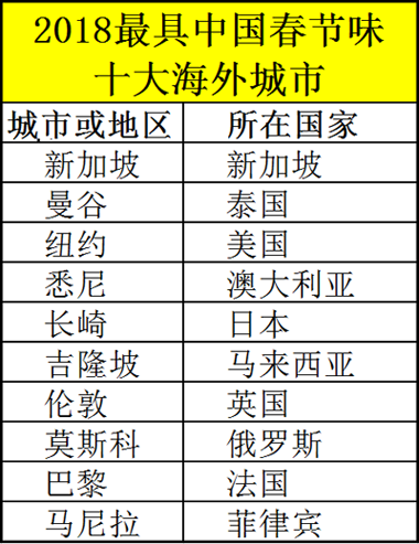 春节期间,马蜂窝旅游网的用户足迹覆盖全球120个国家、3944个城市和地区。携程数据显示,230个国内城市的旅游者通过携程网站、APP和门店,预订跟团游、自由行、定制旅游、当地玩乐等产品,到达70余个国家、海内外800多个目的地城市。春节已在许多国家成为越来越本土化的节日,根据携程组织到境外国家的旅游团和领队的调查反馈,2018年最具中国春节味的十大海外城市依次是:新加坡、曼谷、纽约、悉尼、长崎、吉隆坡、伦敦、莫斯科、巴黎、马尼拉,遍布在亚洲、欧洲、美洲、澳洲等各大洲。