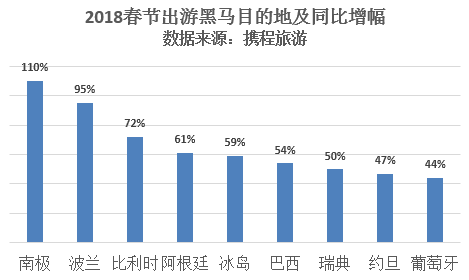 一些小众目的地也进入中国游客的视野,携程数据显示,今年春节增长最快的十大小众黑马目的地,分别为南极、波兰、比利时、阿根廷、冰岛、巴西、瑞典、约旦、葡萄牙。
