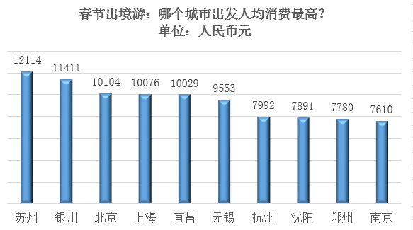 春节出游热情最高的城市分别是上海、北京、广州、成都、深圳、杭州、南京、天津、西安、武汉、昆明、郑州、济南、重庆、长沙、三亚、厦门、无锡、合肥、哈尔滨。春节出境游人均花费最高的城市依次是苏州、银川、北京、上海、宜昌、无锡、杭州、沈阳、郑州、南京,除了北上等一线城市、苏州、无锡、杭州、南京等江浙人均收入较高的城市成为黑马,西北的银川、中部的郑州、东北的沈阳也榜上有名。