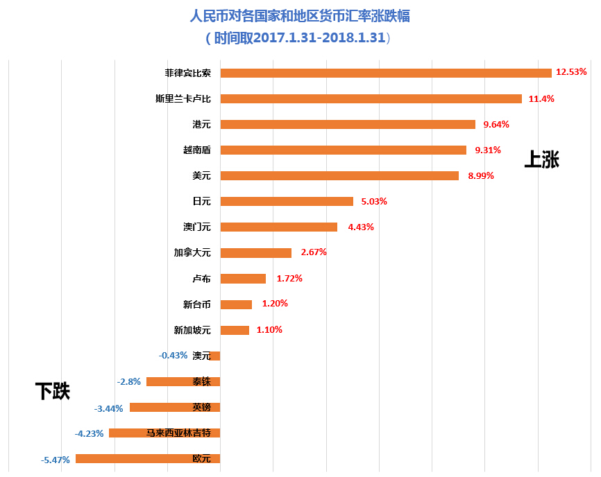 2017年人民币持续升值,也推动了出境旅游热。报告根据截至2018年1月31日的一年内人民币汇率对各国货币汇率涨跌幅度,发布了年度“汇率涨幅十大目的地”:菲律宾、斯里兰卡、中国香港、越南、美国、日本、中国澳门、加拿大、俄罗斯、中国台湾。人民币对菲律宾比索、斯里兰卡卢比、港元以12.5%、11.4%、9.6%的升值幅度,排名前三。人民币对美元以9%的升值幅度位居第五。预计汇率的利好还将影响2018年全年的出境旅游市场。