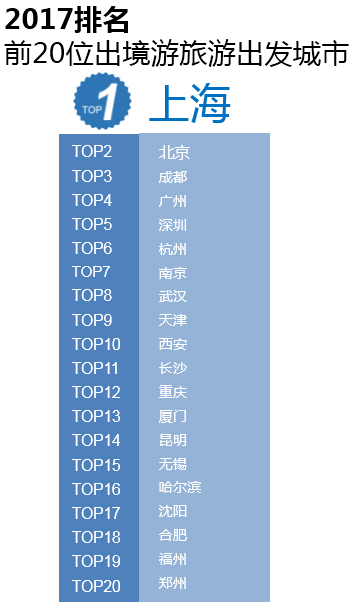 2017年排名前20位的出境旅游出发城市为:上海、北京、成都、广州、深圳、杭州、南京、武汉、天津、西安、长沙、重庆、厦门、昆明、无锡、哈尔滨、沈阳、合肥、福州、郑州。出境旅游人数增长速度最快的前10名城市分别为西安、长沙、无锡、太原、武汉、合肥、成都、南京、哈尔滨、昆明。