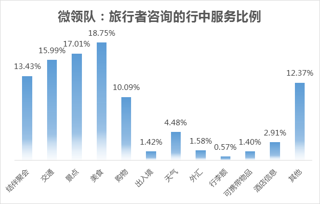 中国游客在出境旅游,特别是自由行的时候,需要哪些服务?根据携程行中服务平台“微领队”大数据,中国自由行用户咨询求助最集中的问题是:交通15.9%、景点17.0%、美食18.7%、结伴聚会13.4%、购物10.0%。其他热点问题还有:天气4.4%、出入境1.4%、外汇1.5%、行李额0.5%等。