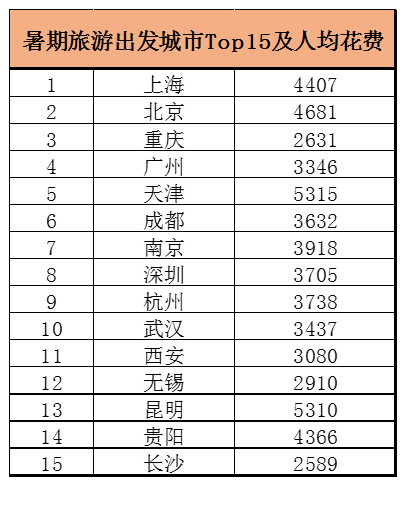 暑期哪里的居民出游最积极?报告根据调查和携程在线预订情况预测了2018暑期15大旅游出发人气城市,分别是上海、北京、重庆、广州、天津、成都、南京、深圳、杭州、武汉、西安、无锡、昆明、贵阳和长沙。研究发现,二、三线城市客源持续增长,重庆首次排名第三。从人均花费看,天津、昆明、北京、上海、贵阳领先。