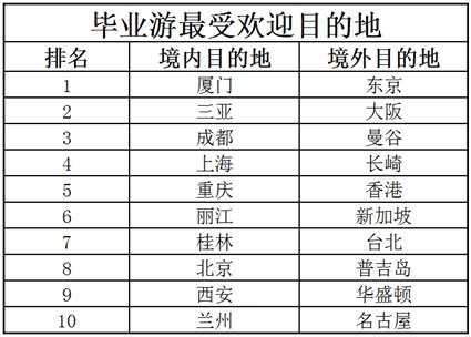 7月,携程网上几百条毕业游产品游客量上涨100%以上。学生群体毕业季出游花费集中在3000元以下,占57%。消费最高的是世界杯观赛主题游产品,头等舱、决赛门票,单人花费超过12万。毕业游以国内为主,厦门、三亚、成都位列最受喜爱国内目的地前三,紧随其后的为上海、重庆、丽江、桂林、北京、西安、兰州。多个城市和景点因为小视频爆红,符合年轻人追求潮流、表达个性的出行主张。
