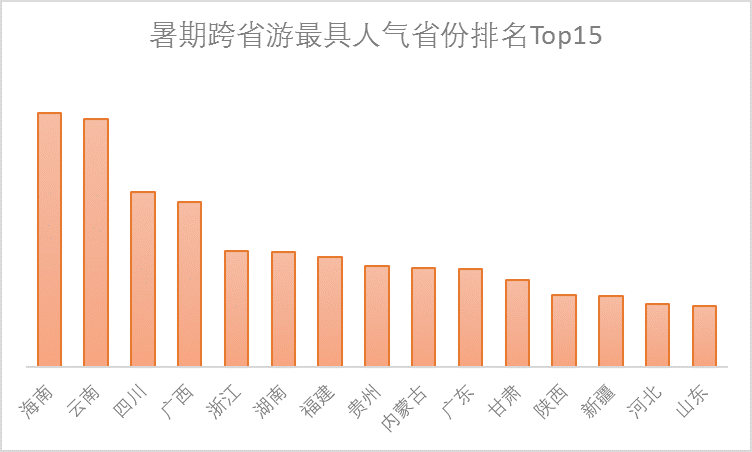 “暑期跨省游最具人气省份”榜单显示,海南、云南、四川、广西、浙江、湖南、福建、贵州、内蒙古、广东、甘肃、陕西、新疆、河北、山东为最具人气跨省游省份。从排行看,海岛、山岳、草原等避暑目的地的预定量持续走高。