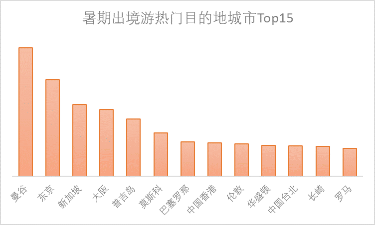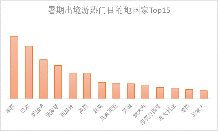 报告预测了暑期人气最高的出境游目的地国家,排名前15位的分别是泰国、日本、新加坡、俄罗斯、西班牙、美国、越南、马来西亚、英国、意大利、印尼、澳大利亚、德国和加拿大。东亚、东南亚仍是最受欢迎目的地。