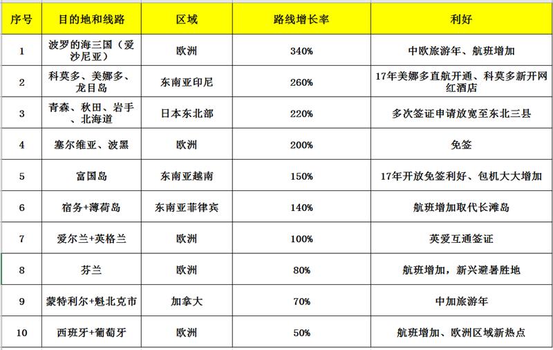 今年暑期,中国游客出境游有更多尝鲜佳选。携程数据显示,今年一些新兴目的地交通和签证的便捷性大大提升,旅游产品更丰富,出游人数上升快。以爱沙尼亚线路为例,报名人数增长340%。报告发布的暑期十大新兴目的地为:欧洲巴尔干地区、波罗的海三国、印尼美娜多、越南富国岛、宿务+薄荷、日本东北部等。
