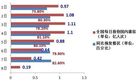 ↑图为10月1日-8日全国每日接待国内游客人次以及同比恢复情况