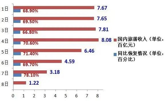 7日,全国共接待国内游客4208.9万人次,同比恢复82.6%;实现国内旅游收入318.4亿元,同比恢复78.1%。