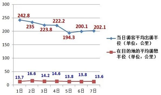 假期第七日,游客平均出游半径202.1公里,在目的地的平均游憩半径为13.6公里。