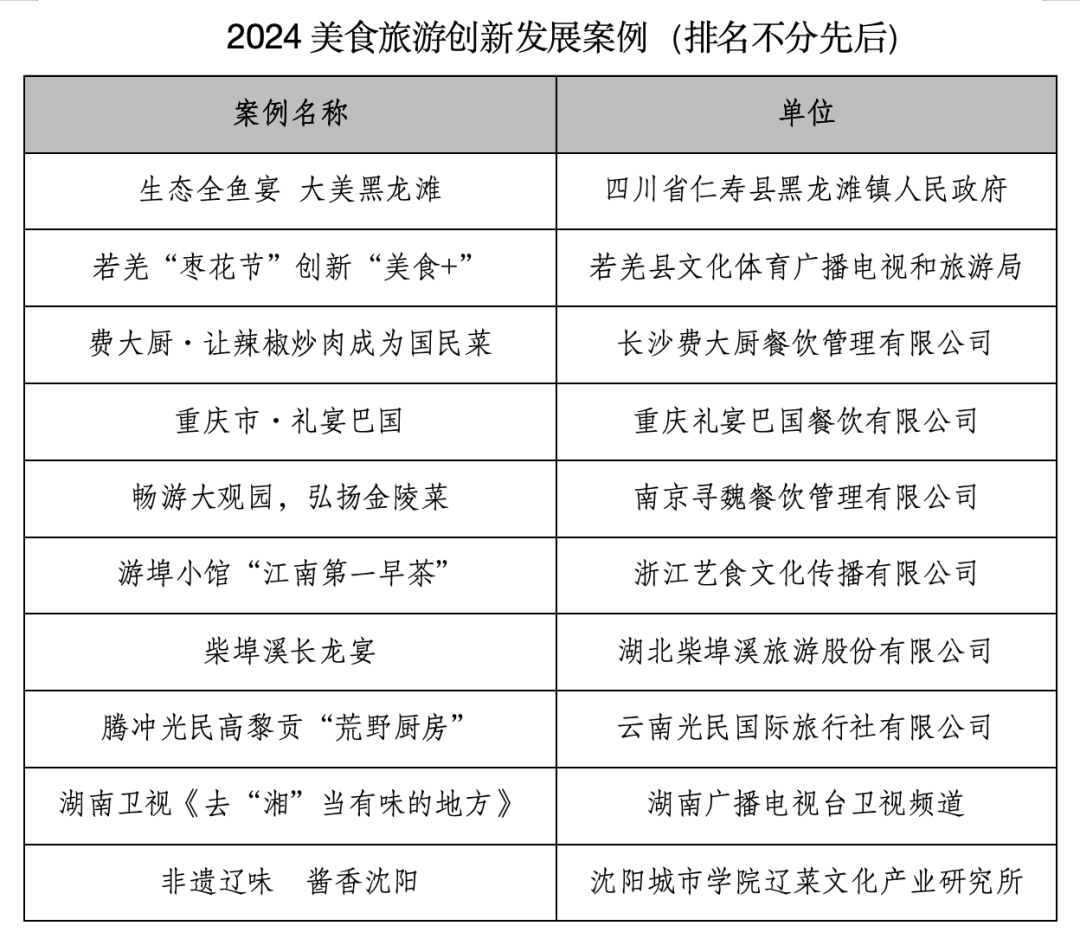 9月21日,由中国旅游研究院、湖南省文化和旅游厅、中共衡阳市委、衡阳市人民政府联合主办,湖南省旅游协会、衡阳市文化旅游广电体育局、衡阳市商务局承办,世界中餐业联合会支持举办的“2024美食旅游发展大会”在湖南衡阳举行。大会发布了“2024美食旅游融合发展案例”与“2024美食旅游创新发展案例”名单。
