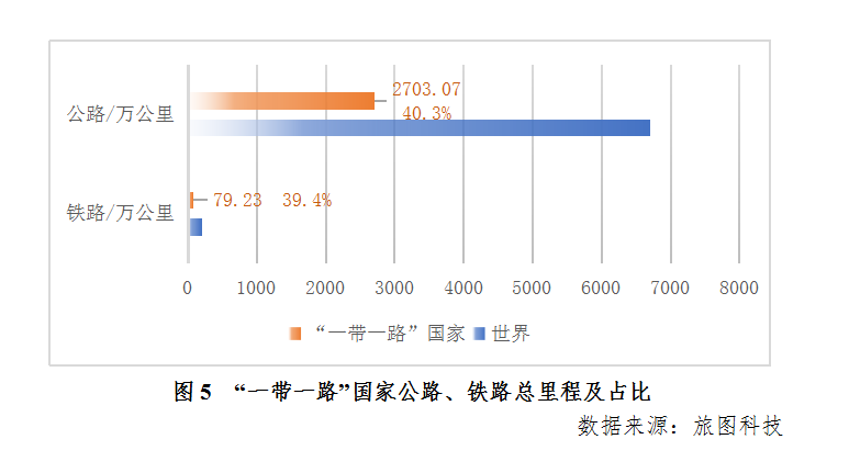 “一带一路”国家公路总里程约2703万公里,占世界公里总里程的40.3%,铁路总里程约79万公里,占世界铁路总里程的39.4%。综合来看,“一带一路”国家道路总里程约占世界道路总里程的2/5。